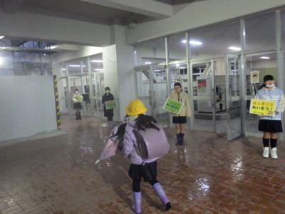 あいさつ100%UP! 2025年1月30日 12時05分 続きを読む 1月は「あいさつ100%アップ計画」としてあいさつの充実を図っています。「大きさ・回数・お客様にも」の観点で自分自身の100%アップ(2倍)を目指します。寒い日や天気の悪い日はどうしても挨拶の声が小さくなりがちですが、そんな状況を変えるために6年生の有志や生活委員会があいさつ運動に取り組んでくれています。達成は簡単ではありませんが、「歴代№1」「市内№1」やがては「日本一」の挨拶ができる学校になることを夢見ています。 閉じる