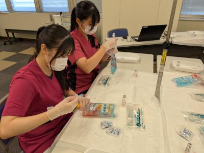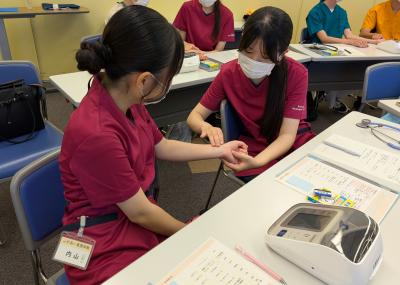 前半は看護の心得などを講義で教えていただき、後半はバイタルデータの計測や模擬の薬液を使った点滴の準備の体験をさせていただきました。