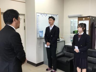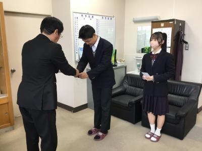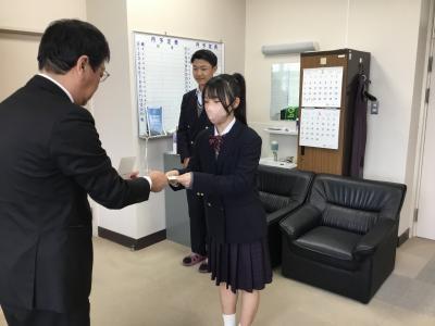 11月11日は「税を考える週間」の初日ですが、小松税務署長 荒井和憲様が来校され、直接受賞生徒に手渡されました。 また、源校長にも感謝状を贈られました。