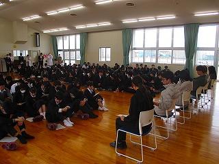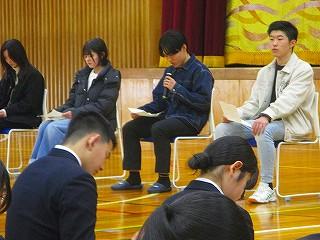 3月17日(月)7限目に卒業生による講話を行いました。今年度の卒業生を招いて、大学受験をどう乗り切ったかについてお話をしていただきました。 文系9名、理系6名、計15名の卒業生に来ていただき、事前に1・2年生から集めた質問に答えてもらいました。