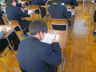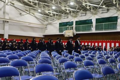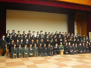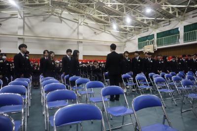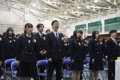 卒業式予行では、卒業式本番に参加しない1年生を含めて全校生徒で校歌斉唱しました。