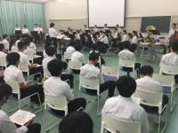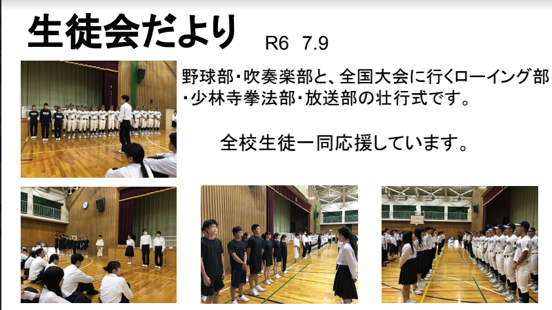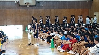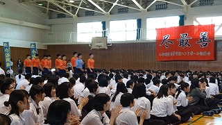 今日は高校総体・総文の壮行式がありました。上杉校長先生から「最大限のパフォーマンスを見せてください。どんなに苦しくてもKeep smiling,keep shining!(笑顔を絶やさず、輝き続ける生徒)を胸にがんばってください。」そして生徒会長の古谷綾香さん(3年辰口中出身)「悔いが残らないように成果を発揮してください。生徒一同応援しています。」と激励の言葉がありました。各部からの決意表明のあと、野球部部員による応援、吹奏楽部の演奏とともに校歌斉唱でエールをおくりました。23日(木)からは西部緑地公園陸上競技場で陸上競技部、25日(土)は和倉温泉多目的グランドでサッカー部、26日(日)は小松市弓道場で弓道部が出場します。応援よろしくお願いします。