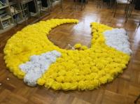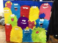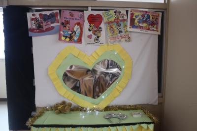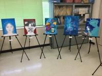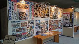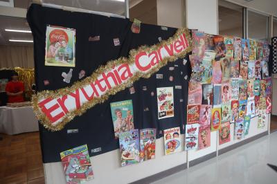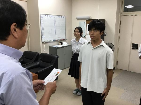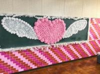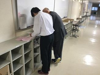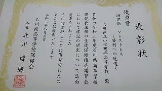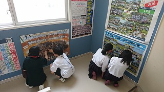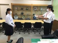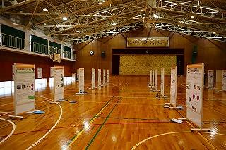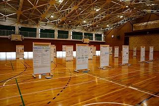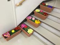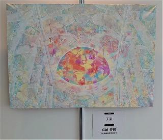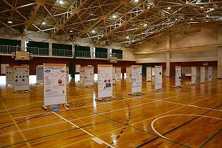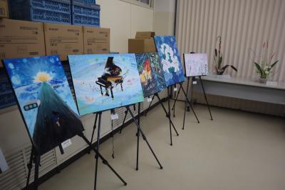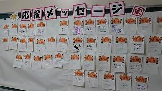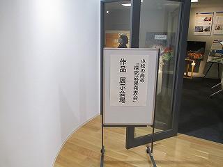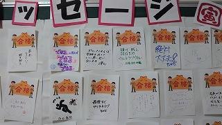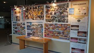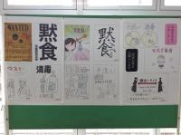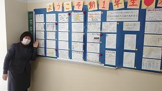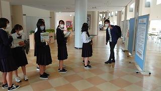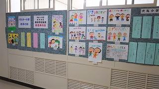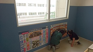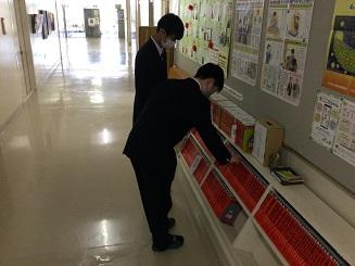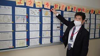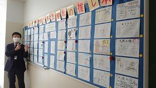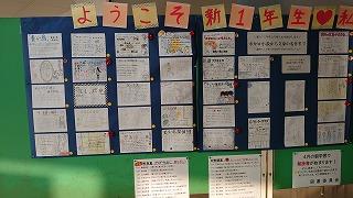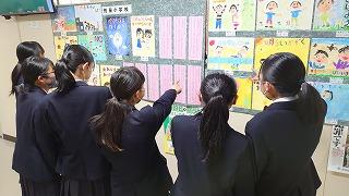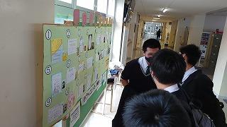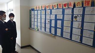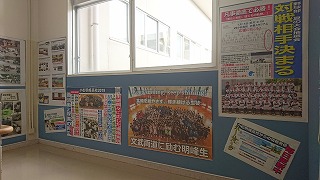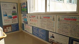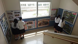 職員室に上がる階段の掲示スペースに展示してあります。
