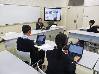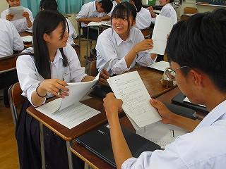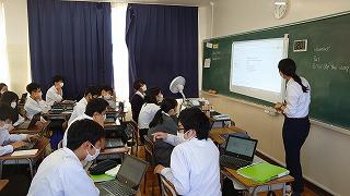 「英語表現」では、グループでOne dayから始まるライティング活動をしています。Chromebookで入力した文字がスクリーンに表示され、その場で先生が添削指導をおこなっています。