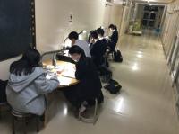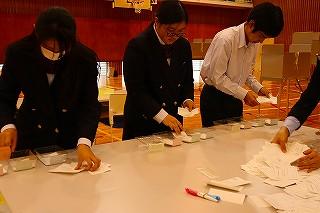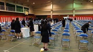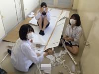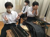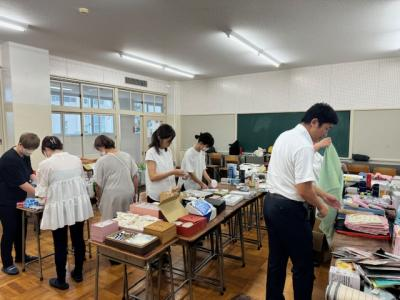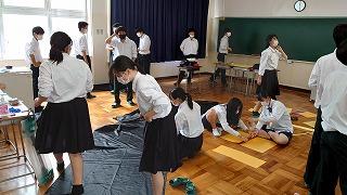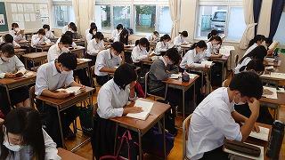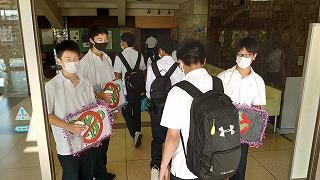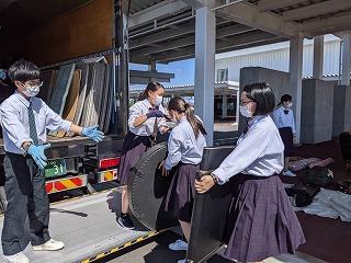 これまでの明峰祭は8月末に3日連続で「体育祭」と「文化祭」がおこなわれていました。昨年の8月18日から31日まで小松市は「緊急行動期間」となり「明峰祭」は中止になりました。とても残念でした。コロナ禍においてもなんとか学校行事を生徒のために実施したい、学校行事を通して生徒の成長につなげたいと考え、今年度は「体育祭」を6月に実施して「明峰祭」は8月27日(金)、28日(土)の2日間と開催を分散しました。明日は小松市公会堂。会場には全校生徒の半数(約350人)が入場し2部制にして密を避けます。感染症対策の基本事項である①マスクの着用②人との距離確保③手指消毒④換気⑤黙食を徹底します。2日目の飲食は指定された場所で受付(名前記入)をおこない、入退室時間やテーブルも指定します。利用者が変わるごとに消毒をします。これらの感染症予防対策を徹底し、活動に制限もありますが、その中でも輝く明峰生の活躍が楽しみです。写真は準備する3年生。