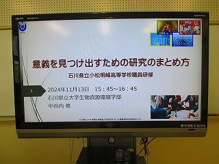 11月13日(水)放課後、本校探究アドバイザーとして石川県立大学から中谷内先生をお招きして、今年度2回目の「課題探究職員向け研修会」を行いました。