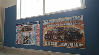 玄関から職員室に上がる階段の壁に生徒の活動を紹介するコーナーを設置しました。学校生活での日々の活動が「生徒一人ひとりの人間力を高めていることにつながっている」と実感できるものにしていきます。「自己肯定感」や「自己有用感」を育み、そして高みを目指す「向上心」につながるようにしたいと考えております。このコーナーの名前、募集します!明峰高校の新名所になればと思っています。11日(木)から始まる保護者懇談にお越しの際は是非お立ち寄りください。