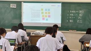 「総合的な探究の時間」では、「Google Jamboad」を使用して、仲間の調べたことに質問や良かったことを付箋に書き込み全員で共有しています。さらに深く調べるヒントをみんなで考えています。