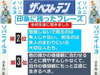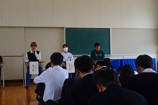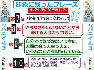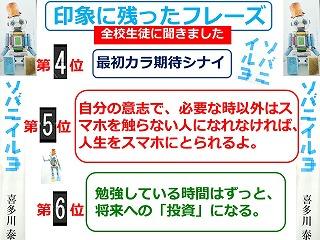 ・今回の講演会を通して,聞いたこと・見たことをこれからの人生に活かし,通りかかったドラゴンの尻尾をつかめるような人間になりたいと思いました。また,一定の場所にとどまっているのではなく冒険をし,いろいろなことを経験していこうと思いました。