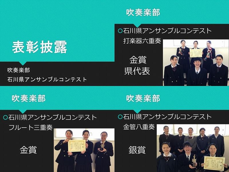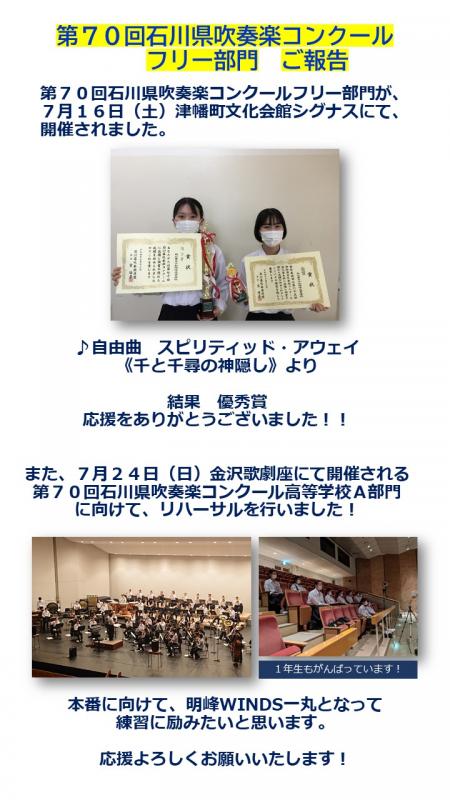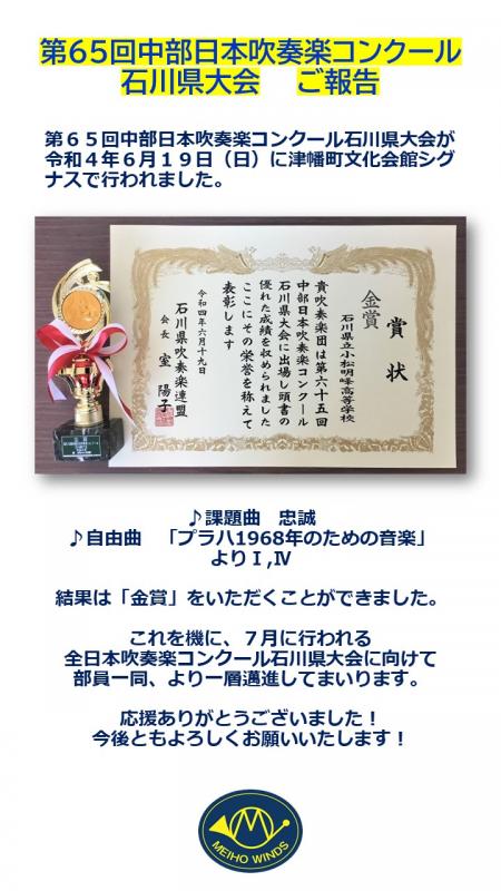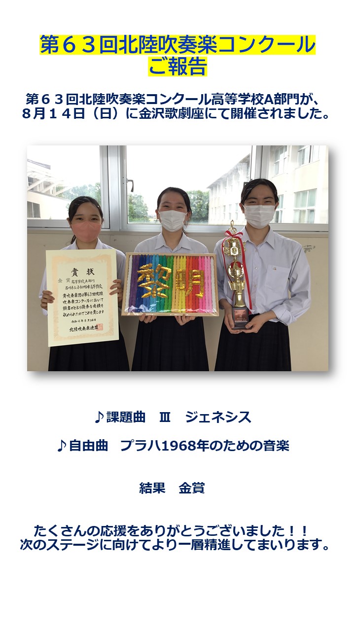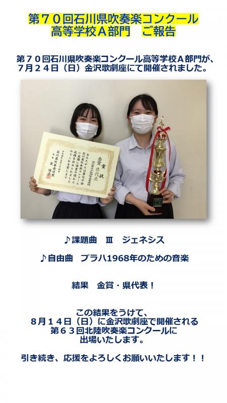 7月におこなわれた第69回石川県吹奏楽コンクール高校A部門で金賞を受賞して県代表になりました。