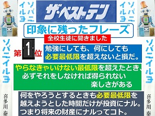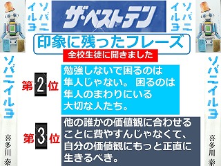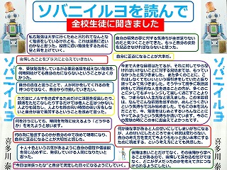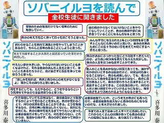 新学習指導要領にある「高等学校における道徳教育の充実」に向けて、全校生徒が道徳教育副教材として『ソバニイルヨ』(喜多川泰 著 幻冬舎)を読みました。人間としての在り方生き方について考えを深めるとともに、生徒の学びに向かう力の醸成を図ることを目的に実施しました。自分自身について深く考え、集団や社会との関わりを理解して、自立した学習者としての学びに向かう力をつけてもらいたいと思っています。印象に残ったフレーズやその感想などを生徒に書いてもらいました。その一部を紹介します。またこのポスターは本校の中央階段踊り場に掲示してあります。ご来校の際には是非ご覧ください。