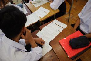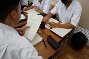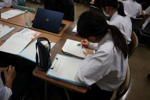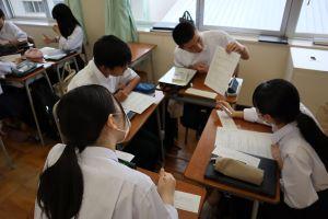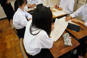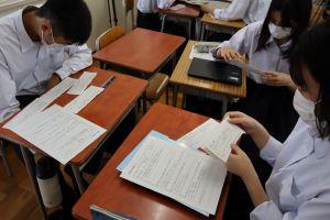 「現代文」では、「ロイロノート」を使用して、先生から送られてきた原稿用紙カードにChromebookや自分のスマホで原稿用紙のマスに合わせてテキスト入力をして提出します。仲間の回答や意見を全員で共有することができます。