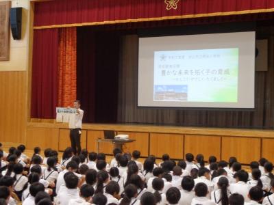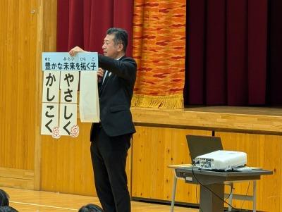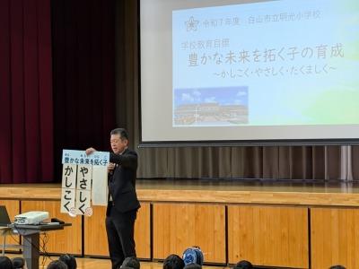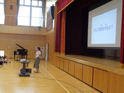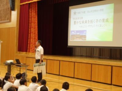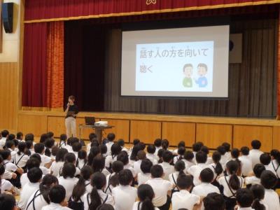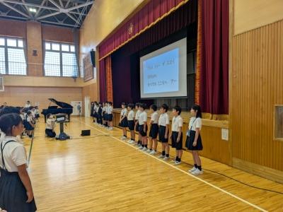 9月29日に10月の全校朝会を行いました。今月は校長先生のお話のあとに、「自分の思いや考えを積極的に伝える力」とはどんな力か全校で確認しました。