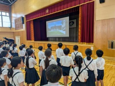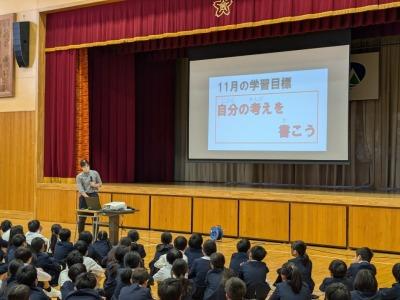 11月5日に全校朝会を行いました。校長先生のお話や11~12月の学習目標や生活目標のお話がありました。最後はみんなで今月の歌を歌いました。