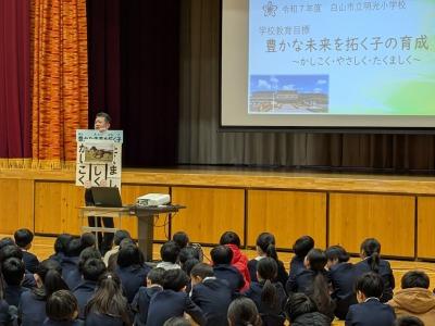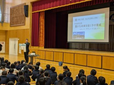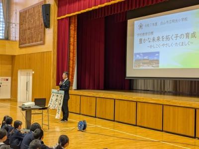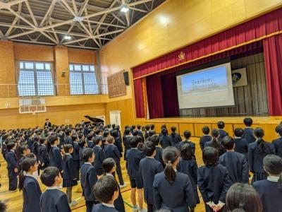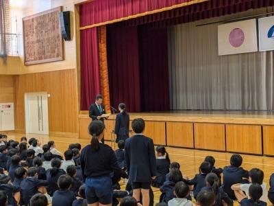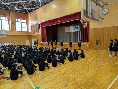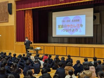 2026年1月8日 14時37分1月8日に3学期の始業式を行いました。校長先生のお話や1・2月の学習や生活目標のお話、運営委員会の企画の説明がありました。最後は全校で大きな声で校歌を斉唱しました。