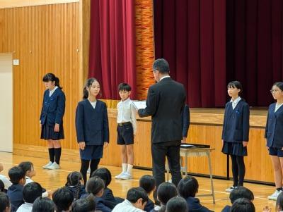 12月1日に全校朝会を行いました。校長先生のお話や硬筆書写コンクールの表彰伝達を行いました。最後に今月の歌を大きな声で歌いました