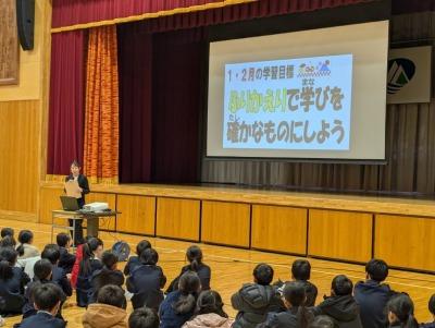 1月8日に3学期の始業式を行いました。校長先生のお話や1・2月の学習や生活目標のお話、運営委員会の企画の説明がありました。最後は全校で大きな声で校歌を斉唱しました。