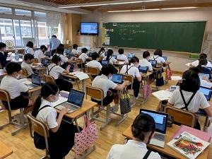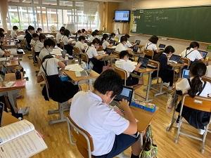 5年生が音楽の授業でタブレットを活用していました。「故郷の人々」の曲を聴き、感想を各自のタブレットに入力しています。入力した感想はモニターに映し、みんなで共有しました。
