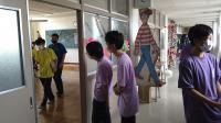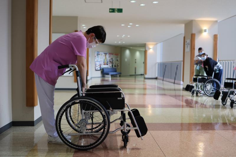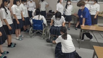 最初に看護師の魅力や仕事の内容について説明いただいた後に、車いす、松葉杖、血圧計、聴診器、防護服を着用させていただく実際の業務に即した体験をしました。生徒につきましては、現場の方の声を聴き、業務に携わる体験をすることで、今後の進路実現に大変参考となる看護ガイダンスを実施することができました。