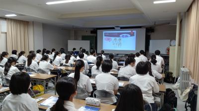 「『看護』とは何か」、「大学で看護を学ぶことについて」、「看護職のハードさとやりがいの大きさ」などのお話に加え、生徒たちの不安や疑問にも一つ一つ丁寧に答えていただきました。