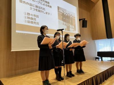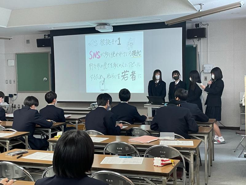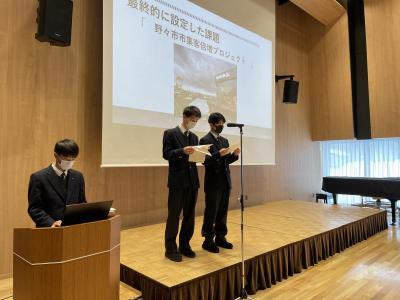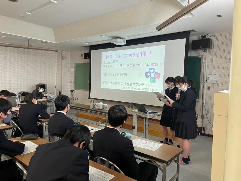 両校とも2グループが参加し、本校は「野々市市PR動画作成」と「野々市市1ランクアップ計画」について、学んだことや、今後野々市市とどのようにかかわっていくかなどを発表しました。