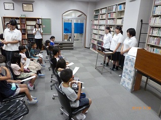 7月30日(火)、野々市市内の放課後子ども教室の児童13名が本校を訪れました。「ののいち子ども読書の日」関連事業の一環で、今年で8年目となります。図書委員、サイエンス部、新聞部が正面玄関で児童を出迎え、まずは校舎内を案内し、続いて図書館の中でさまざまな体験をしてもらいました。