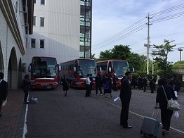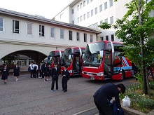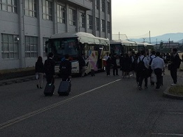 好天の気持ちよい朝、学校に7台のバスが並びます。修学旅行隊のバスです。荷物を持った生徒たちが、どんどん集まります。集合時間5分前には全員の生徒が集合し、予定通りの出発となりました。この後、富山空港から羽田経由で北海道に向かいます。たくさんの学びと、たくさんの思い出を作ってきてください。