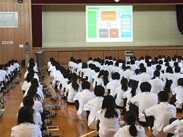 1年生で行われているクリエイティブ人材育成事業で、株式会社アビックスタジオ金沢の専務取締役で映像プロデューサーの野呂昌春先生をお招きして、講演会を行いました。この事業で1年生は学校のCM制作を目指していますので、CMとは何か、どのような意図や心構えを持って取り組むべきか、そのために日常の中で大切なものは何かといったことについてお話をいただきました。生徒たちは、正しく正確に伝えることの大切さや日々の当たり前のことの大切さを感じ取ることができたようです。