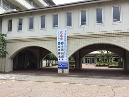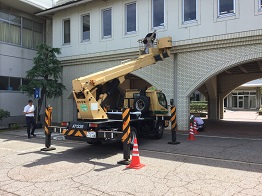 午前中、学校の前に工事車両がやってきて工事を始めました。校舎の改修が始まったかと思いきや、実は高校総体出場をたたえる懸垂幕の設置工事でした。きれいな懸垂幕ができあがりましたので、是非一度ご覧になってください。