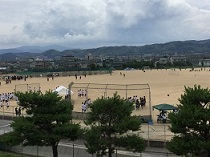 そして、何より今日はクラスマッチの日。各学年で、クラス対抗形式のいわゆる球技大会です。バレーボールやサッカーはどこの学校でもおなじみですが、本校ではキックベースもあります。これらの種目で生徒たちが優勝目指して頑張りました。結果、1年生は13H、2年生は27H、3年生は34Hが優勝しました。生徒の皆さんの頑張りと先生方の尽力で、暑い中大きなけがなどもなく終えることができました。ありがとうございました。