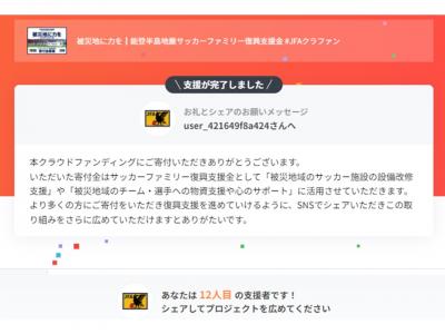 『被災地に力を┃能登半島地震サッカーファミリー復興支援金 #JFAクラファン』に寄付させていただきました。