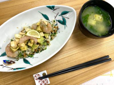 ◎甘海老のアボカド丼(大根菜のへしこまぶし飯)