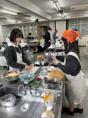 家庭部は現在、1年生17名、2年生13名の30名が在籍しており、クッキングをメインに週1回、金曜日に活動を行っています。料理コンテストにも積極的に参加し、郷土料理や地元食材を使ったメニューの考案など、みんなで意見を出し合い、楽しみながら活動を行っています。興味のある人は金曜日に調理室へ見学に来てくださいね!