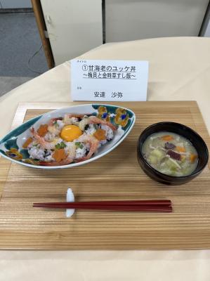 実技審査は13日に青木クッキングスクールで行われました。1時間という時間制限があり、慣れないコンテスト会場の雰囲気に緊張しながらも無事作品をしあげることができました。審査委員の方々からは、食材の組み合わせが面白いと高い評価をいただき、優秀賞に選ばれました。
