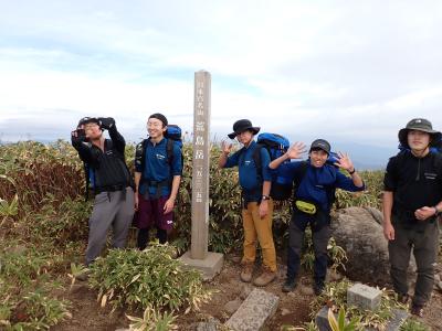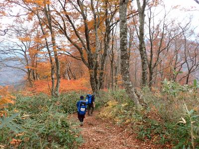 荒島岳は、標高差が1000mほどある少し登りごたえのある山であり、登山道はスキー場跡の舗装路から始まり、緩やかな箇所や急なところ、滑りやすい箇所など変化に富むため飽きずに歩くことができる山でした。部員は、ザックの重さに苦労しながらも、意外としっかりと歩けている様子が見られました。紅葉に関しては、少し時期が遅く、標高700~800m程度の箇所で、少しだけ鮮やかに色づいた葉を見ることができました。