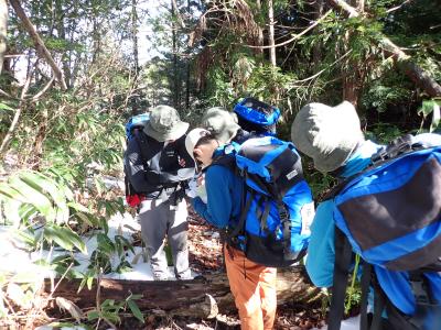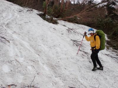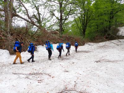 今回は、チブリ尾根避難小屋までのルート確認と雪上歩行練習が目的でした。避難小屋周辺の斜面でロープなども使用してトレーニングを行う予定でしたが、避難小屋に到着する直前で弱いものの雨が降り始めたため、念のために樹林帯まで標高を下げて、滑って落ちても大丈夫(すぐに停止する)な斜面で、短時間の雪上歩行練習を実施しました。1年ぶりの雪上歩行ということで、足を滑らせる様子も見られましたが、徐々に歩けるようになっていました。また、久しぶりの重いテント泊装備に苦労している様子も見られ、下山は雨で登山道がぬかるむ箇所も多く、雪のないところでのスリップも目立ち、歩行に課題が残りました。