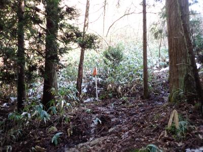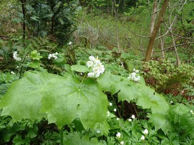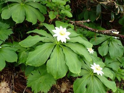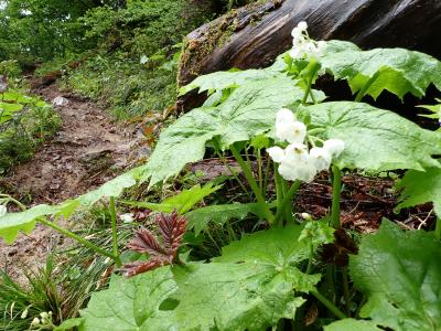 《標高1050m付近の登山道脇。サンカヨウ(中央大きな葉)とニリンソウ(右下の小さな葉)の群生がきれいでした。》