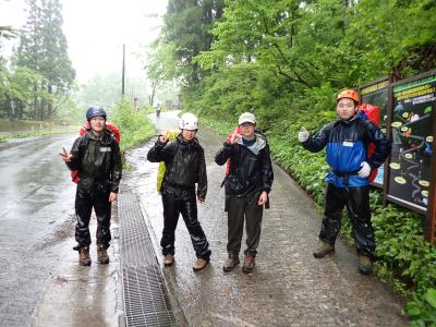 《下山後の姿。雨具を着用しているが、全身びしょびしょ。》