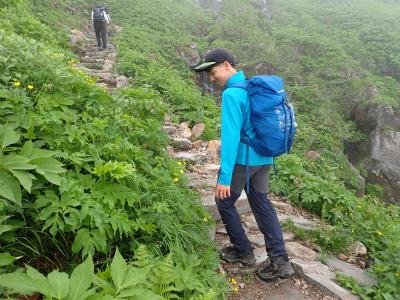 《ミヤマキンバイなど、黄色い植物が楽しめる十二曲がりを登る》