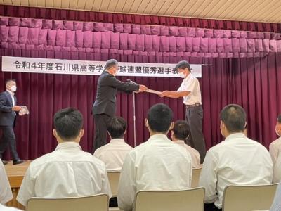 本日、令和4年度石川県高野連優秀選手表彰式がありました。本校から丸岡仙彦君(35H)が受賞しました。受賞できたのは選手1人の力ではなく、チーム全員の力だと思います。おめでとうございます。