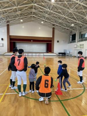 12月26日(月)に愛里巣福祉会アクティーエイトの児童たちと野球教室を行いました。はじめに体操、ラダー、鬼ごっこを通して交流を深めました。その後、キャッチボール、バッティング、ゲームなど野球につながる活動を行いました。とても楽しい時間を過ごすことができました。