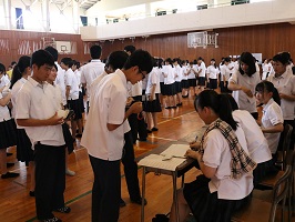 今週は補習はありませんが、3年生が登校し主として自学自習を進める登校学習会が行われています。通常と同じ時間に登校し、慣れた自分の机で、自分で立てた計画に基づいて学習に取り組んでいます。わからないことがあれば、すぐに先生に質問することができ、途中で希望者参加の特別講義も行っています。外は暑い日々ですが、学校の中でも熱い取り組みが行われており、志望校合格を目指してみんなで頑張っています。