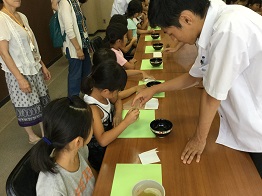 フラワーアレンジメントでは、3種類のお花を使ってそれぞれで作品を作ります。生徒たちも一生懸命手伝ったりアドバイスをしたりしていました。茶道体験では、お点前をいただくだけでなく、実際にお茶を点てることにも挑戦し、生徒の助けも借りて一生懸命茶筅を動かしていました。