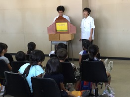 そんな中、今日は野々市市立館野小学校の1,2年生18名が本校を訪問してくれました。学校の中を少し見学した後、合唱部の歌、華道部によるフラワーアレンジメント、図書委員による読み聞かせや紙芝居、茶道部によるお茶体験、サイエンス部による空気砲実験等を体験しました。はじめはお互いに緊張した様子でしたが、次第に打ち解け、子供たちの元気な声が広がっていました。