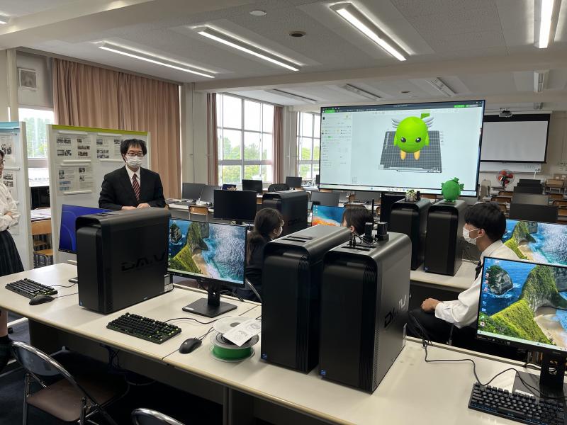 3Dプリンターで本校のマスコットキャラクター「りんくん」を作成している様子を見てもらいました。