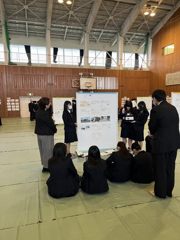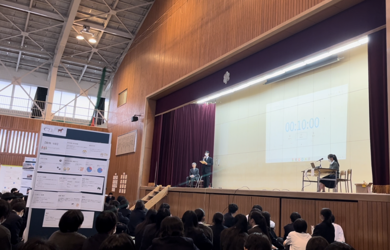 当日は生憎の雨で少し声が通りづらかったり、体育館が暗くスライドが見えにくい場面もありましたが、4回の発表の中で発表の仕方や声の出し方などを工夫しながら、最後までやりきりました。