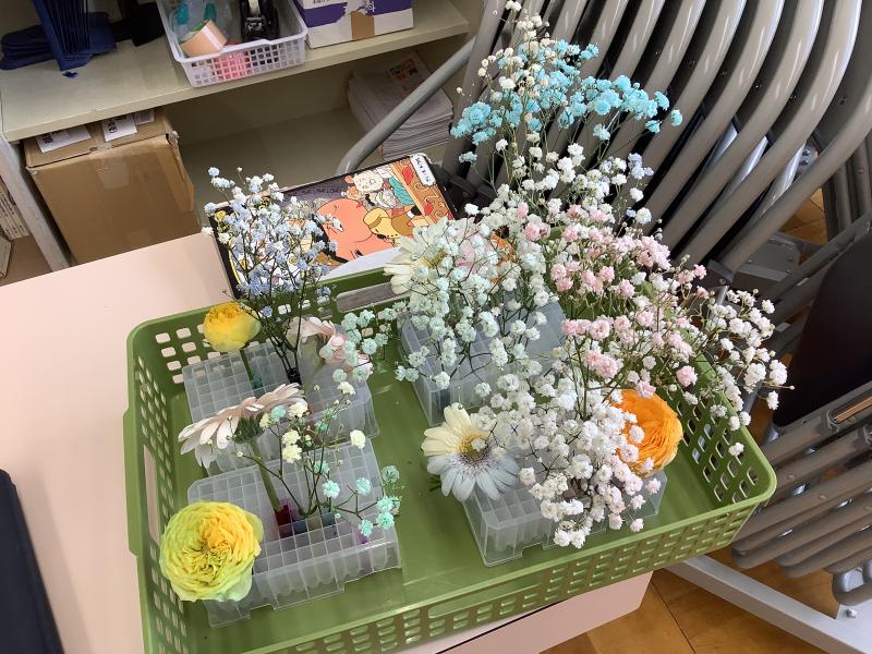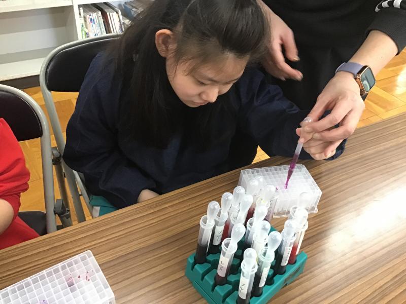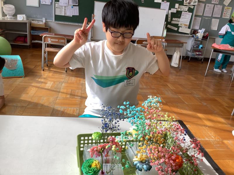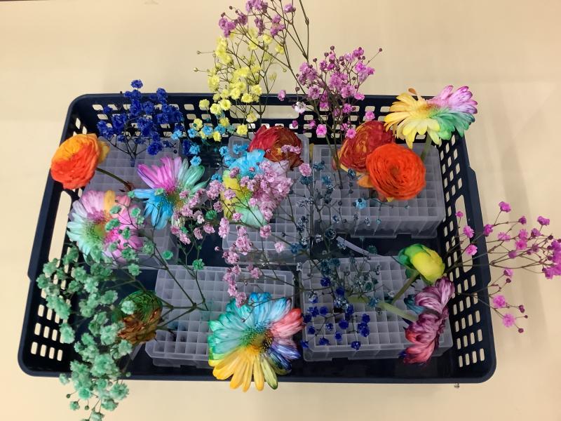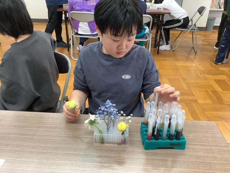 インクに花の茎をつけておくことで、花びらが染まる実験です。花びらを複数の色に染めるときは、茎を何股かに割く必要があります。子ども達は、事前に茎を割く練習を行い、好きな色のインクを選んで、スポイトを使って容器に入れました。スポイトを使用する時の子ども達の真剣なまなざしが印象的でした。インクの入った容器に茎を挿して、そのあとは色が着くのを待ちます。