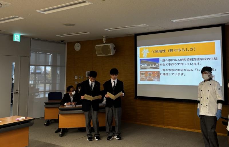 2025年12月1日 14時43分文化祭舞台発表で報告した通り、高3「総合的な探究の時間」ブランド申請部の学習では、菓子製造班の明和ハニーマフィンを野々市ブランドにしようと活動してきました。9月24日(水)にブランド申請部全員で書類を提出するために市役所に行ってきましたが、11月26日(水)には選抜メンバーで審査員にプレゼンをしてきました。
