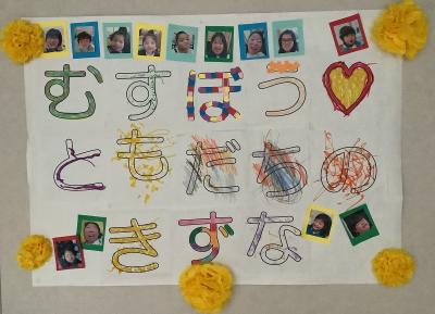 1人一文字を担当して作り上げた今年のスローガン「むすぼう ともだちの きずな」の披露で幕を開け、