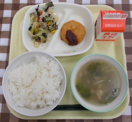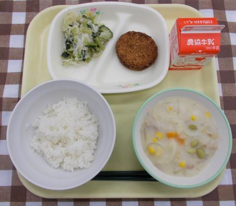 白ごはん、メンチカツ、グリーンサラダ、クリームシチュー、牛乳